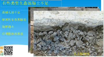 一、傳統混凝土,是指用水泥作膠凝材料,砂、石作骨料,與水按一定比例配合,經攪拌而得的水泥混凝土,也稱普通混凝土,它廣泛應用于土木工程。但是,普通混凝土材料是一種堿性材料,一般不能生長植物,用于河道護坡,對生態具有較大的破壞作用
